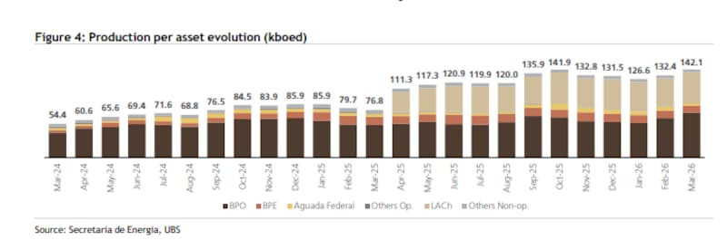 UBS proyecta que la producción total para 2026 alcanzará los 158.800 kboed, un 13% por encima de la guía oficial de la empresa de 140.000 kboed.