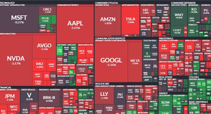 Las caídas se concentran principalmente en el sector financiero y en compañías vinculadas al consumo y telecomunicaciones, mientras que el segmento energético muestra retrocesos más moderados.