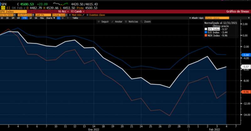En lo que va del año, el S&P500 cae 5,5%. Con una dinámica mejor, el Dow Jones cae 3,4% mientras que el índice más golpeado es el Nasdaq que acumula una pérdida del 10% en 2022.