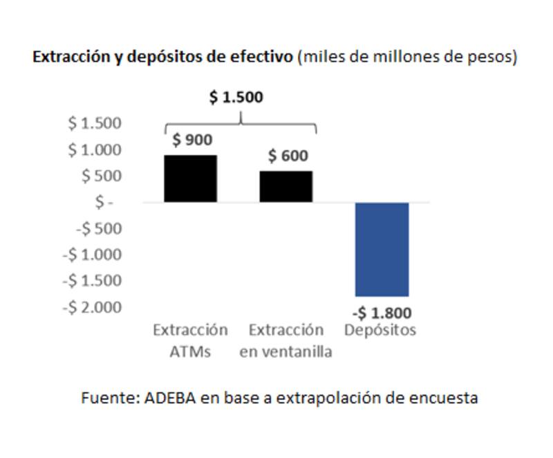 En total, el retiro total fue de $ 1,5 billones; lo que equivale a 1500 millones de billetes de $ 1000, tansolo en un mes. En ese mismo lapso de tiempo, los depósitos en efectivo sumaron $ 1,8 billones.