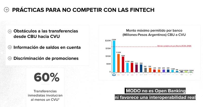 También se quejan de que "los bancos comparten en MODO información bancaria de los usuarios como los saldos y últimos movimientos de las cuentas pero no comparten esta información a sus competidores fintech e impiden que otras billeteras digitales accedan a sus promociones".