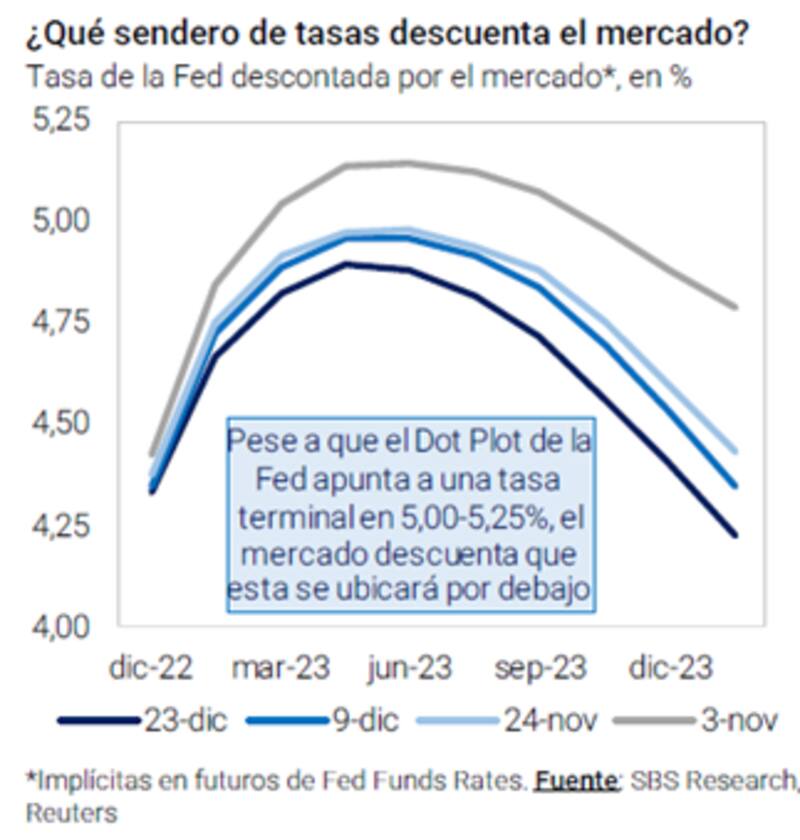 Sin embargo, el mercado no le cree del todo a la Fed y sigue esperando una tasa terminal menor, más cercana a 4,8%, versus el 5,1% que muestra el Dot Plot.