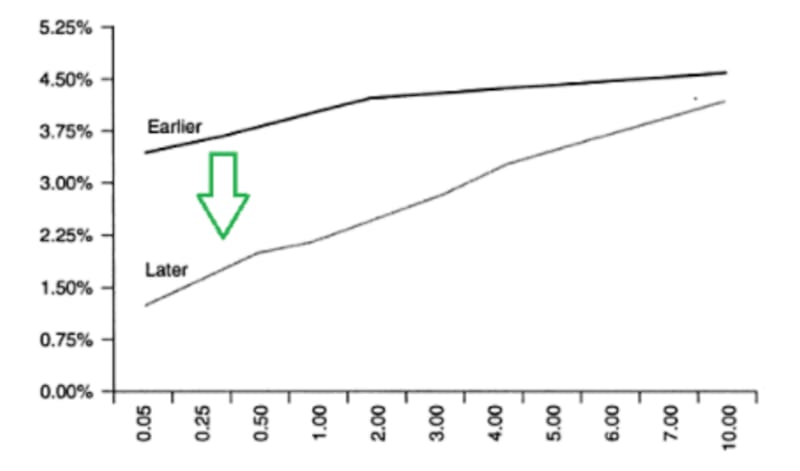 Otra opción de empinamiento de la curva puede darse a partir de un estancamiento en la parte larga y un desplome de las tasas cortas. Esto se lo conoce como "bull steepener".