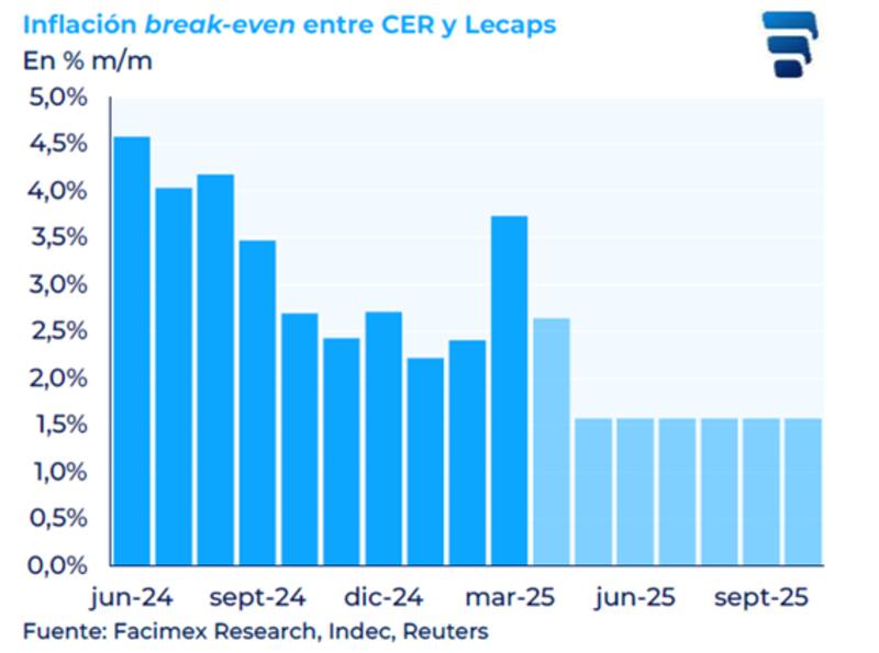 Concretamente, recomiendan la lecap a mayo (S30Y5), con una tasa de 2,5% efectivo mensual. El tipo de cambio breakeven, es decir, el valor de indiferencia entre comprar una Lecap y mantener una posición en dólares, es de $1207.