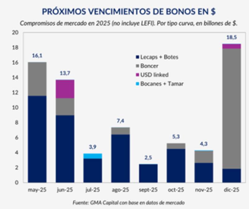 Tanto mayo como junio son dos meses con abultados vencimientos ya que a los $16,1 billones de mayo se le suman luego los $13,7 billones de vencimientos de junio.