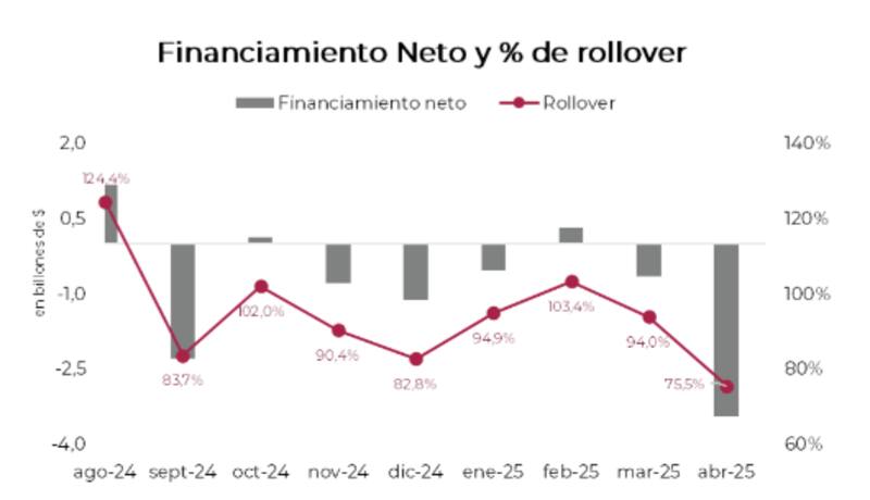 En abril, el Tesoro registró un rollover del 75,5%, adjudicando $5,2 billones en la última licitación frente a vencimientos por $7,5 billones.