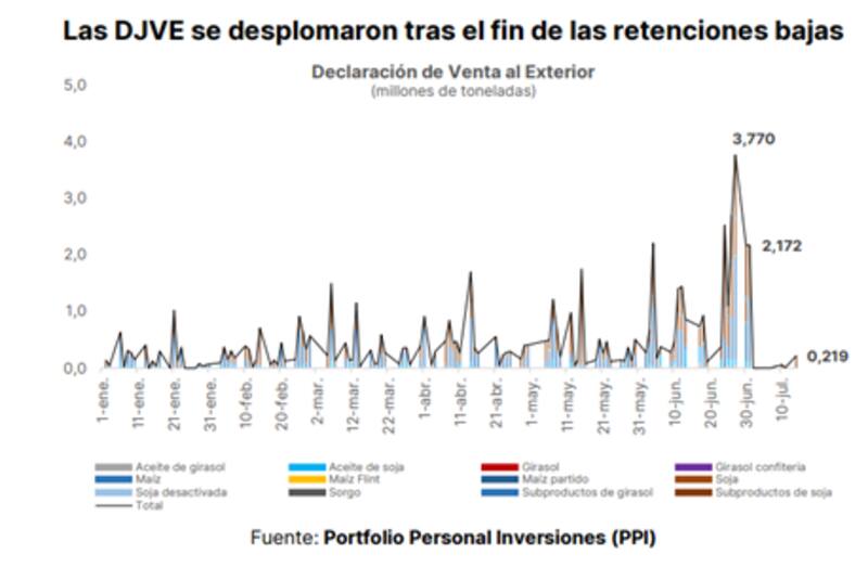 En este sentido, indicaron que los nuevos registros de Declaraciones Juradas de Ventas al Exterior (DJVE) fueron prácticamente nulos desde el 01 de julio, último día en que se registraron DJVE a una retención menor.