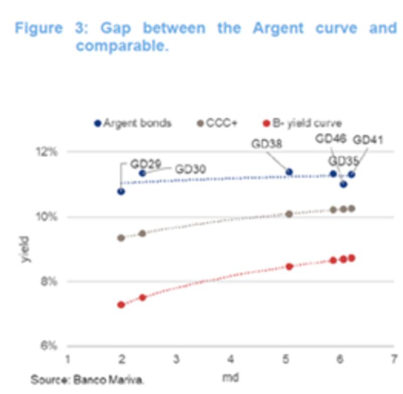 "Los bonos soberanos en dólares acumulan caídas recientes, en un contexto donde subieron sus rendimientos a lo largo de toda la curva. Pero, más que un cambio de escenario macroeconómico, esta baja parece estar reflejando el ruido político doméstico y la incertidumbre de corto plazo hasta las elecciones de medio término, más que una ruptura con el modelo de estabilización vigente", explicó.