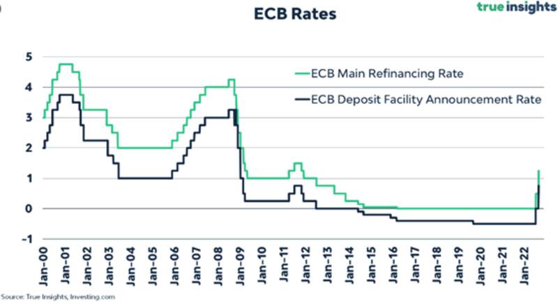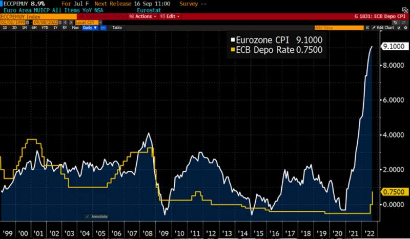 Si bien la subida de 75 puntos básicos en la tasa es la mayor suba de tasas del BCE en su historia, el BCE todavía está muy por detrás de la curva.