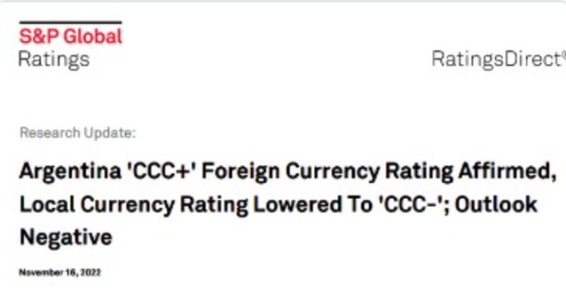 La calificadora S&P Global degrado la calificación de riesgo de Argentina en moneda local a CCC- con perspectiva negativa, a la vez que dejó a la calificación de deuda en dólares en CCC+.
