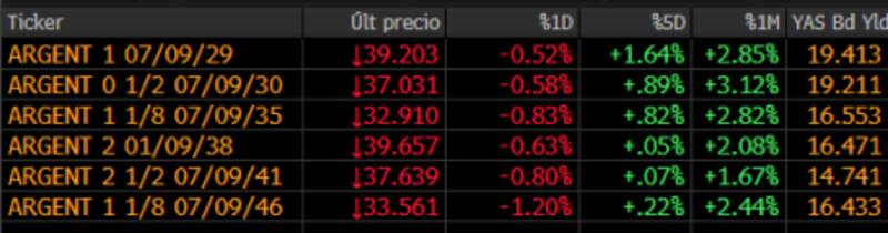 En la parte media de la curva, los Globales 2035 y 2038 caen 0,83% y 0,63% respectivamente, mientras que, en el extremo mas largo, las bajas son del 0,8% y 1,2% para los Globales 2041 y 2046 respectivamente.