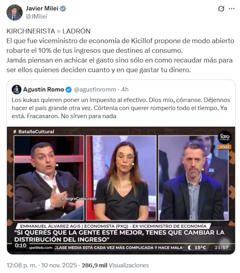 “El que fue viceministro de economía de (Axel) Kicillof propone de modo abierto robarte el 10% de tus ingresos que destines al consumo. Jamás piensan en achicar el gasto, sino en cómo recaudar más para ser ellos quienes deciden cuánto y en qué gastar tu dinero”, escribió Milei en X (ex Twitter).