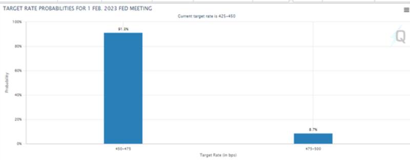 Actualmente, la probabilidad de ver una suba de 25 puntos básicos en febrero se disparó a 91% contra solamente 9% las chances de ver un hike de 50 puntos básicos.