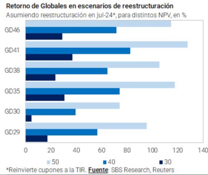 Según Juan Manuel Franco, economista jefe de Grupo SBS, mirando hacia una eventual reestructuración en 2024 y pensando en un Valor Presente Neto de los nuevos bonos a entregar de 30 dólares, los Globales cortos a 2029 y 2030 ofrecerían retornos de entre 20% y 5%.