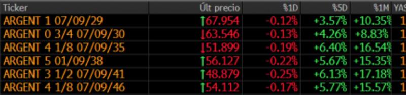 En coincidencia, los bonos argentinos hicieron una pausa en medio del rally de un promedio de suba en los globales de 5% en los últimos cinco días de operaciones. Caían levemente hasta 0,25% los bonos más largos, como el global 41.