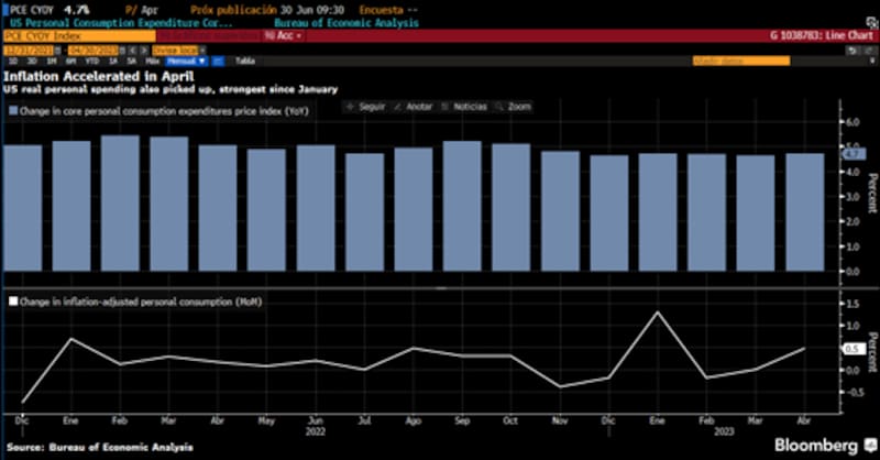 Por otro lado, el indicador de inflación al consumidor preferido por la Reserva Federal (PCE), aumentó un 0,4% en abril respecto al mes anterior y un 4,4% respecto al año anterior.
