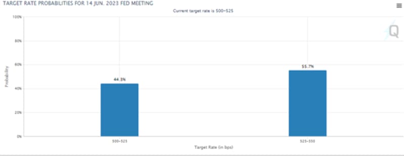 En concreto, para la reunión del 14 de junio, el mercado ahora espera que la Fed eleve la tasa de interés en 25 puntos básicos.