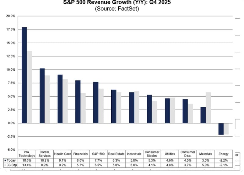 Se espera que las acciones que forman parte del S&P500 informen un crecimiento interanual de los ingresos del 7,7 % para el cuarto trimestre de 2025, según FactSet.