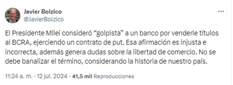 Antes, Javier Bolzico, titular de Adeba había posteado en X: "El Presidente Milei consideró "golpista" a un banco por venderle títulos al BCRA, ejerciendo un contrato de put. Esa afirmación es injusta e incorrecta, además genera dudas sobre la libertad de comercio. No se debe banalizar el término, considerando la historia de nuestro país", sostuvo.