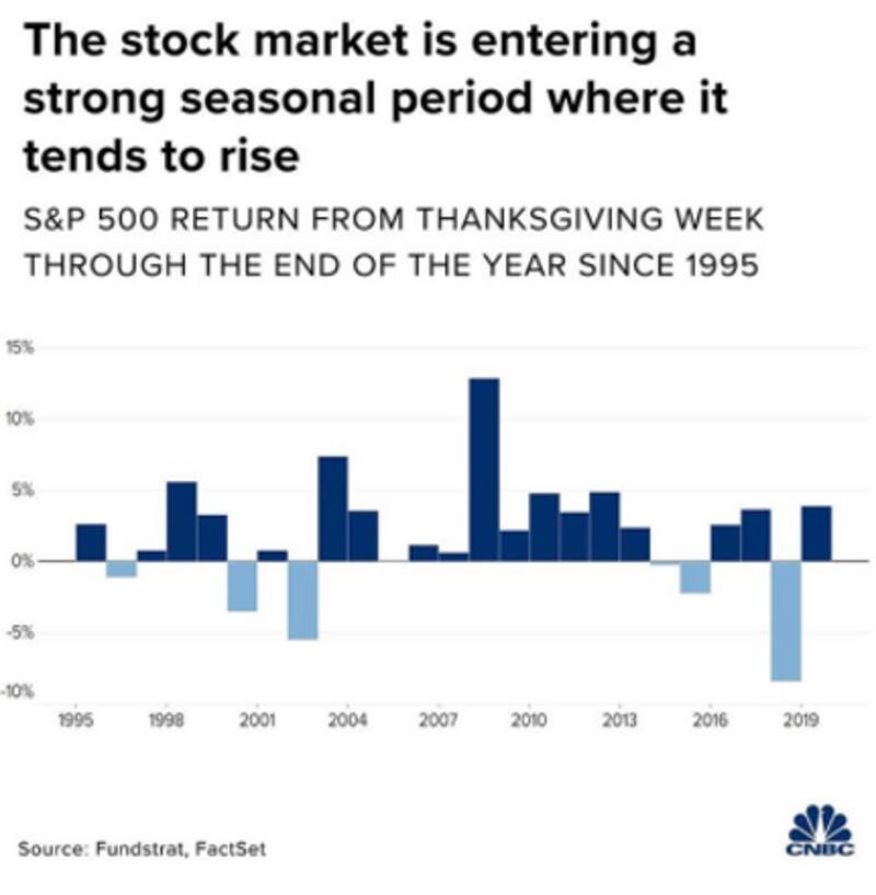 En base a un análisis llevado a cabo por FactSet y publicado recientemente por la cadena CNBC, desde 1995 a 2019, únicamente en cinco años el mercado americano generó un rendimiento negativo posterior al Día de Acción de Gracias y hasta final de año. Se han visto picos de suba en dicho periodo de más de 10% y con un promedio de ganancia de 4 por ciento.