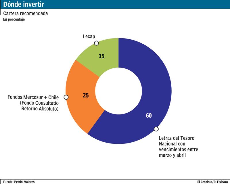 Por otro lado, un 25% de la cartera estaría compuesta de fondos comunes de inversión que invierten principalmente en activos de la zona Mercosur + Chile como el fondo Consultatio Retorno Absoluto. Además, el 15% restante estaría destinado a la compra de Lecaps con vencimiento marzo con rendimientos del 45% TNA o 55% TEA, aprovechando el rendimiento real positivo que permitiría obtener estas tasas, pero con una porción acotada dentro del portafolio.