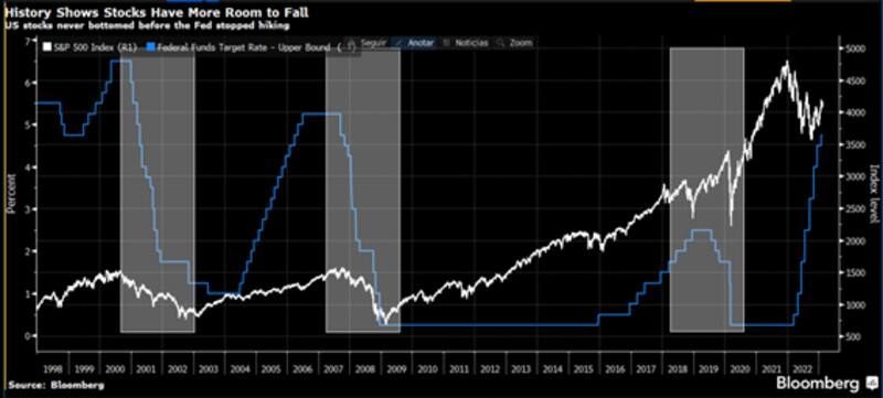 Según datos recopilados por Bloomberg, el S&P 500 suele alcanzar su piso solo después de que la Fed dejara de subir las tasas en ciclos anteriores de alzas. Esto implica un viento de frente si la tendencia de suba de tasas de la Fed se mantiene.