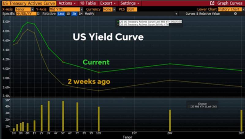 La especulación con mayores subas de tasas hizo que los rendimientos de los bonos del tesoro americano se desplacen hacia arriba muy abruptamente en las últimas dos semanas, con incrementos de hasta 50 puntos básicos.