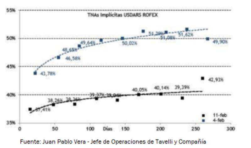 Juan Pablo Vera, Jefe de Operaciones de Tavelli y Compañía detalló que las tasas implícitas en la curva de dólar futuro se encontraban el 4 de febrero pasado en niveles desde 43% en la parte corta y 51% en la parte larga. Tras los dichos de Guzmán, las tasas de devaluación implícita dentro curva se desplazó fuertemente a la baja, pasando a niveles de 37% en la parte corta y 42% en la parte larga, es decir, una marcada reducción en la expectativa de devaluación.