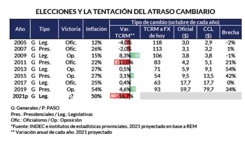 "Si se cumpliera la promesa del Ministro de Economía de que el tipo de cambio se deslizará 25% en 2021, pero la inflación cerrara en 50%, como espera el REM, la apreciación del tipo de cambio real multilateral (TCRM) superaría el 16% este año, asumiendo que no hay grandes cambios internacionales. Hasta ahora, la mayor apreciación real reciente en un año electoral había sido en 2011, con una caída de 13% del TCRM", remarcó.