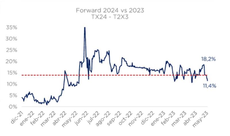 Las tasas de interés de esos bonos pasaron de rendir 12,3% en promedio al 9,5% actualmente. Esto hizo que la tasa forward entre el T2X3 y el TX24 comprima hasta el 11,4% desde el 18,2% de hace unas semanas atrás.