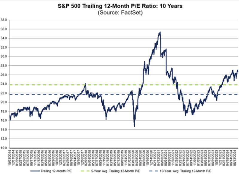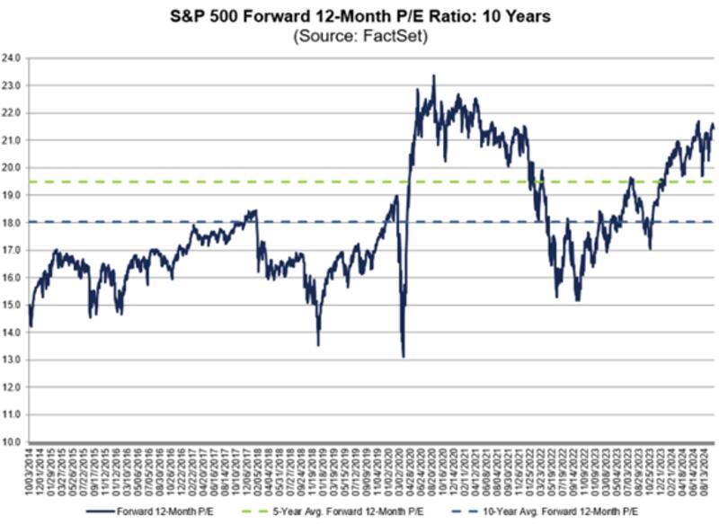 El ratio P/E forward a 12 meses se ubica en 21 veces ganancia, cuando el promedio de 5 años es de 19,5 veces ganancia y el promedio a 10 años es de 18 veces ganancias.