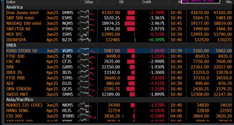 El S&P500 muestra una baja del 3,5%, siendo la mayor caída diaria desde septiembre de 2022, de igual manera que el Nasdaq, que también registra su mayor caída diaria desde dicha fecha.