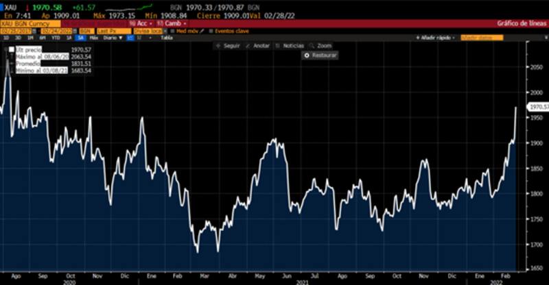 Debido a la escalada bélica, los inversores aplicaron estrategias defensivas en sus portafolios, por lo que se observa una fuerte suba en el oro que avanza 3,25% a u$s 1970 la onza y se ubica en su mayor valor desde septiembre de 2020.