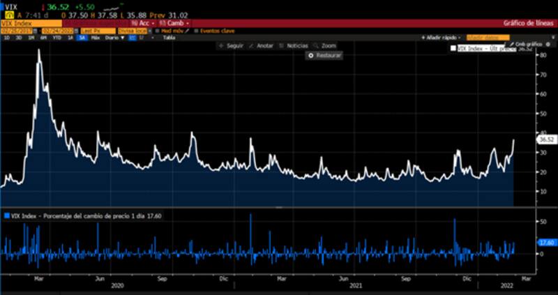 El índice VIX se dispara un 17% y se ubica en 36,5 puntos. De esta manera, el índice se ubica en su mayor valor en un año.