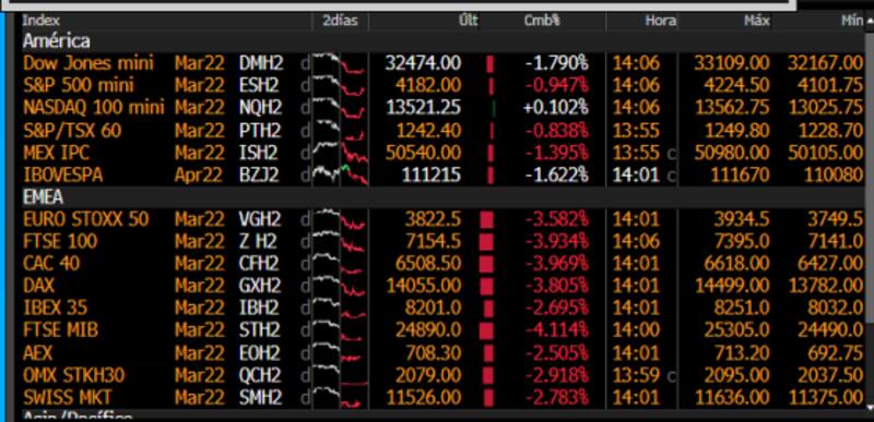 Las bolsas europeas cerraron con perdidas de 3,5% evidenciadas en el Stoxx50. El FTSE de Milán es el índice que más cae, con una baja del 4,1%, seguido por el FTSE100 de Londres, el CAC 40 de Francia y el DAX30 de Alemania que bajan entre 3,9% y 3,8%