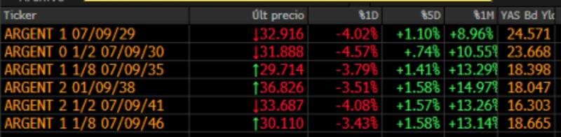 Finalmente, los bonos a 2041 y 2046 pierden 4,1% y 3,43% respectivamente.