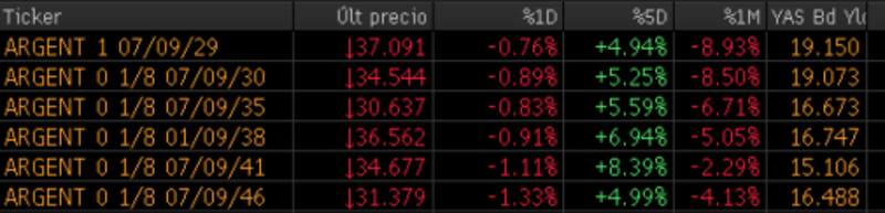 De esta manera, los bonos siguen bajo presión y sus rendimientos continúan en niveles muy altos para los estándares mundiales. La deuda argentina con legislación local rinde por encima del 22% en la parte más corta y por encima del 17% en el tramo más largo. La curva de ley Nueva York, en tanto, rinde 19% en el tramo más corto y 15% en el más largo.