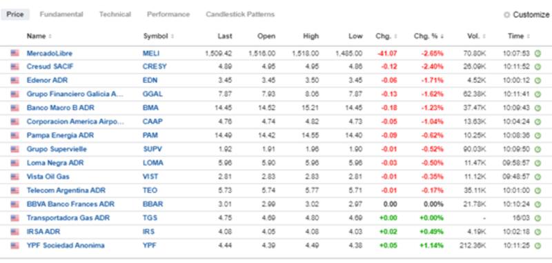 En el día de hoy, y contagiadas de la dinámica negativa de las acciones en Wall Street, las acciones argentinas en Estados Unidos operan mayormente a la baja. Lideradas por MercadoLibre, que cae 2,65%, las compañías argentinas pierden posiciones. Le siguen Cresud y Edenor, que retroceden 2,4% y 1,7% respectivamente, así como también Grupo Financiero Galicia y Banco Macro que anotan desmejoras respectivas de 1,6% y 1,2%. En el otro extremo, solo YPF e IRSA suben en el día de hoy, ganando 1,4% y 0,5% respectivamente.