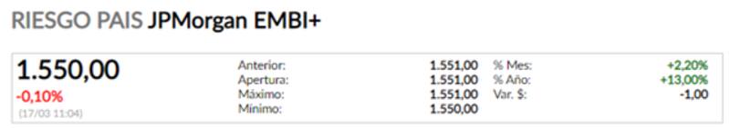 En línea con la debilidad de los bonos, el riesgo país se mantiene en 1550 puntos. De esta manera, el indicador sube casi 500 puntos desde el canje de deuda pasado, o un 42%.