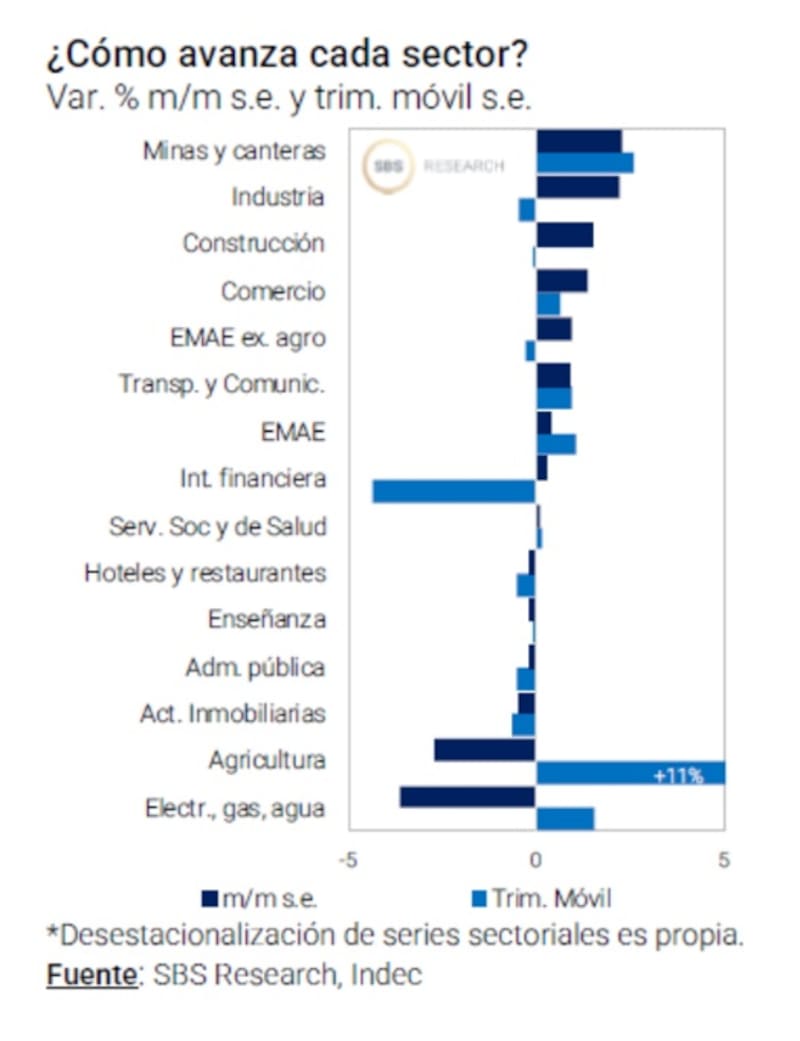 Con este registro, en el trimestre el EMAE sube 1,1% trimestral (sin estacionalidad), y es el sexto mes consecutivo en positivo, si se toma como referencia los trimestres móviles.