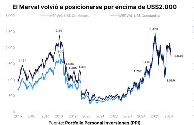 El S&P Merval (CCL) se ubica un 17% debajo de sus máximos históricos y 10% debajo de los picos de fin de 2025.