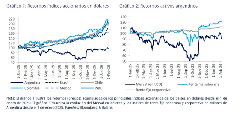 “En lo que va de 2026 el Merval en dólares acumula una caída de 4,5%, por debajo de los principales índices regionales, y en 2025 registró una baja en dólares, mientras que el resto de la región obtuvo retornos superiores. A diferencia de la renta fija argentina en dólares, que ya se ubica por encima de los niveles de comienzos de 2025, el Merval aún no recuperó sus máximos y permanece por debajo del pico alcanzado en enero de 2025”, detallaron.