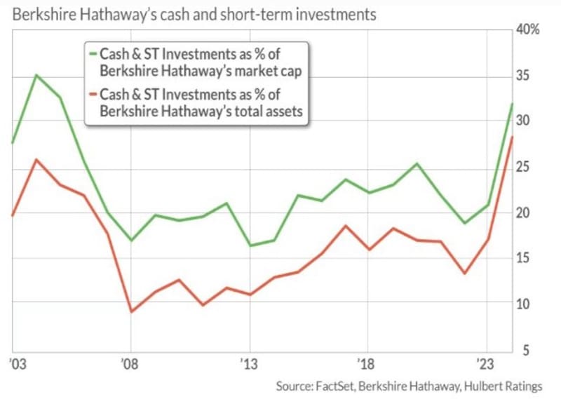 "El gráfico adjunto muestra el efectivo y las inversiones a corto plazo de Berkshire durante las últimas dos décadas, tanto como porcentaje de los activos totales de la empresa como de su valor de mercado", explicó el especialista.