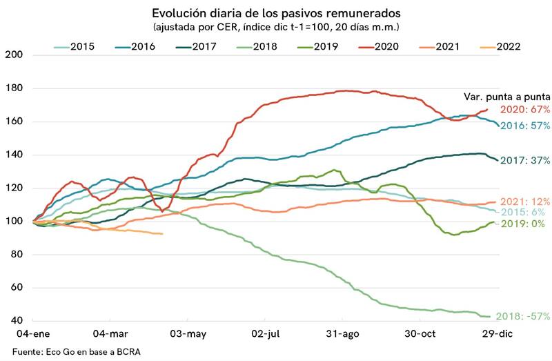 "No hay una bola creciente de Leliq. En los hechos los pasivos remunerados a precios de hoy bajan levemente", marca Sebastián Menescaldi, director de Eco Go. Y aporta un gráfico en el que puede verse con nitidez que la evolución de los pasivos remunerados en el primer cuatrimestre de este 2022, en términos reales, no solo están decreciendo, sino que incluso es la menor para los últimos 8 años.
