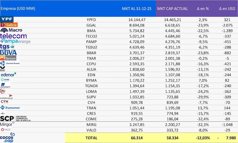 Sucede que si se comparan las capitalizaciones bursátiles actuales con las de cierre de 2025, el deterioro del mercado accionario se vuelve más evidente.