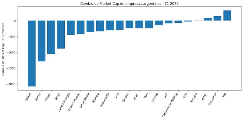 El trimestre también mostró algunas compañías con resiliencia dentro del mercado local. Algunas firmas consiguieron aumentar su capitalización bursátil pese al clima global más incierto. YPF sumó cerca de u$s 321 millones de valor de mercado, mientras que Transener y BYMA también registraron mejoras. Los datos se desprenden de una consulta hecha por El Cronista a Cocos Capital.