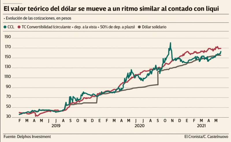 Delphos estima que de no existir el denominado "descalabro" de emisión, el CCL debería estar 5% arriba del dólar solidario o 5% abajo. Es decir, tanto el crawling peg del mercado formal como la suba que viene mostrando el paralelo podrían seguir funcionando en un rango similar al actual siempre y cuando el Covid no dispare una megaemisión.