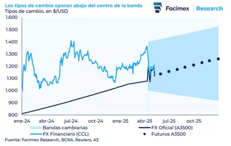 "Si el tipo de cambio emprende una trayectoria hacia el piso de la banda, o al menos se mantiene estable cerca de los niveles actuales, habría espacio para posicionamientos en pesos, sujeto a los riesgos tradicionales de estas estrategias. Esto podría llevarse a cabo considerando por ejemplo Lecaps con vencimiento entre julio y octubre, que tienen un tipo de cambio de indiferencia en el rango de $1.215 - $1.315, aunque resaltando que estos quedan por debajo del techo de la banda", afirmó.