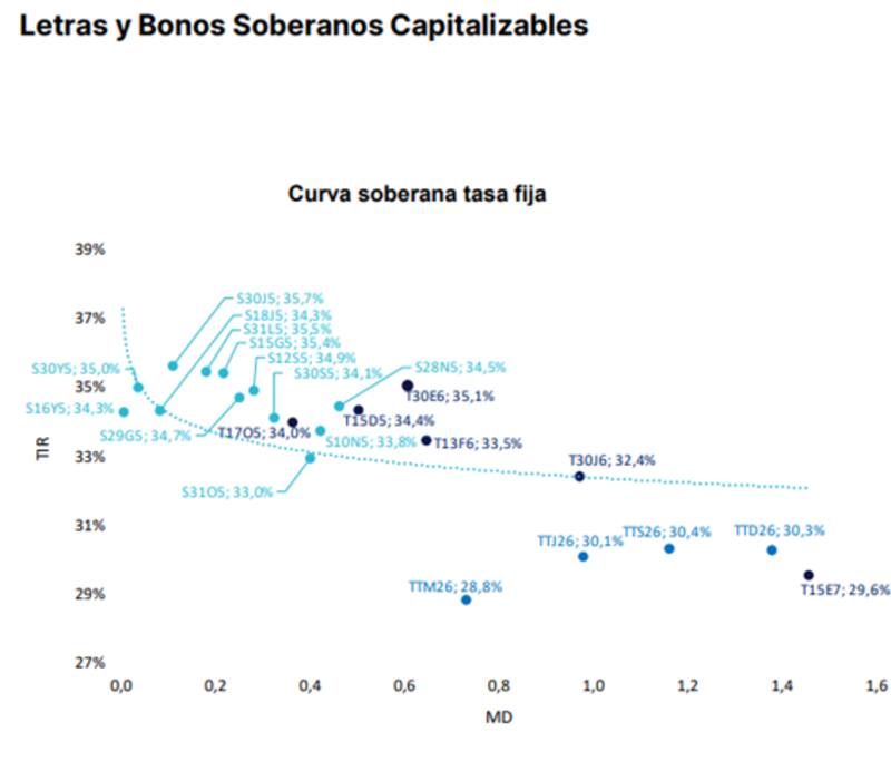 La curva de Lecap opera con tasas del 35% en el tramo corto, bajando al33% en el tramo medio y en torno al 30% en el tramo más largo.