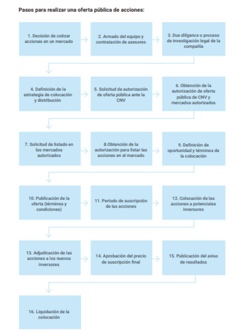 La guía de oferta publica de acciones publicada por la CNV consta de 16 pasos.